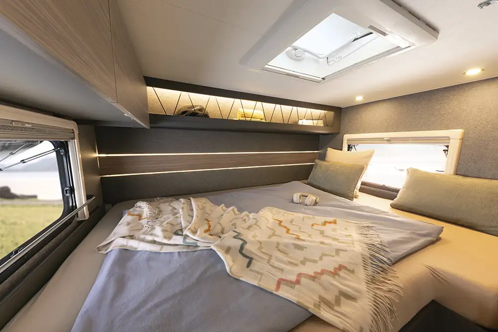 Der Grundriss des Globebus Performance T16 ist serienmäßig für zwei Personen ausgelegt: vorn eine Halbdinette, hinten ein Querbett mit 198 Zentimeter Länge und bis zu 142 Zentimeter Breite, dazwischen eine Küchenzeile mit viel Stauraum sowie einem höhergelegten Kühlschrank und gegenüber ein geräumiges Bad mit Rollo-Tür, das dank seiner Schwenkwand im Handumdrehen zur Dusche wird.
