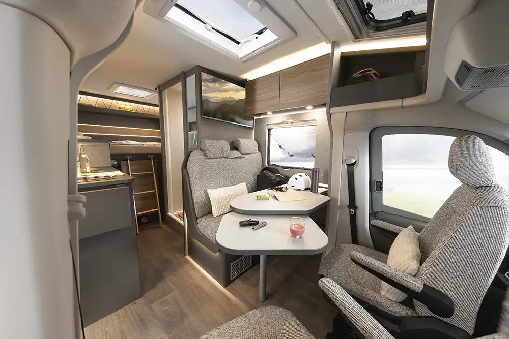 Trotz seiner agilen Fahrzeuglänge bietet der neue Grundriss T16 viel Bewegungsfreiheit im Wohnraum, einen wintertauglichen Aufbau und eine große Heckgarage mit zwei Türen, in der sich neben Campingmöbeln auch zwei Fahrräder verstauen lassen.