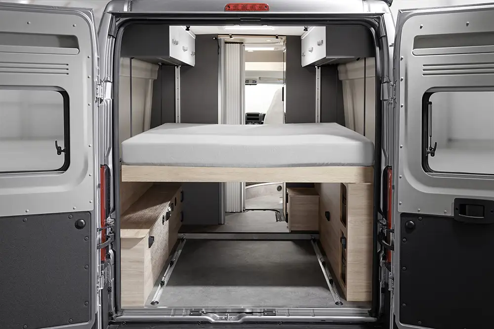 Dethleffs erweitert seine Camper-Van-Baureihe Globetrail um das Modell Globetrail 640 HR – das erste Modell mit einem Hubbett. Mit bis zu 200 Zentimeter Länge, 156 Zentimeter Breite und elf Zentimeter dicker Kaltschaummatratze bietet das längs im Heck eingebaute Hubbett besten Schlafkomfort für zwei. Ein leichtgängiger, manueller Hubmechanismus gewährleistet das einfache Heben und Senken des Bettes. Dank der stufenlosen Höhenverstellung lässt sich das Hubbett in jeder Position arretieren, sodass sich die Liegehöhe variabel wählen lässt. Wird das Bett ganz nach oben geschoben misst der Heckstauraum 1232 Millimeter in der Breite, 1800 Millimeter in der Tiefe und bis zu 1330 Millimeter in der Höhe. Dazu kommen die beiden fest eingebauten Stauschränke links und rechts mit viel Platz für Reiseutensilien.